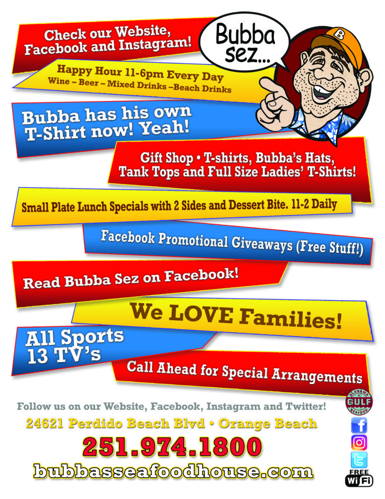 Welcome to the beach and to Bubba’s Seafood House! We’ve been an Orange Beach favorite with locals and tourists alike since we opened in 1997. Just recently, we remodeled everyone’s favorite hangout and made it even better. We enclosed our front porch, built another bar area, set up the Famous Bushwhacker Bar, and built a 40-foot lighthouse pass-through on the way outdoors. Plus, we built the biggest sandbox on the island for all the kiddos to enjoy.